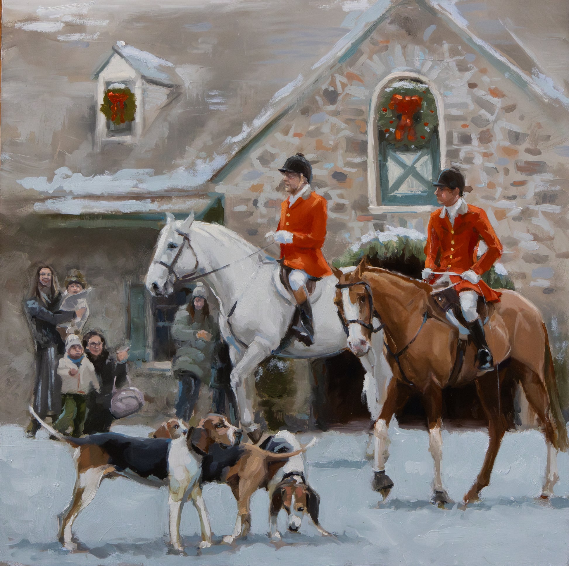 Inspired by the Radnor Hunt Christmas Eve meet at the beautiful Brynclovis Farm. Framed 18 x 18 oil on board.