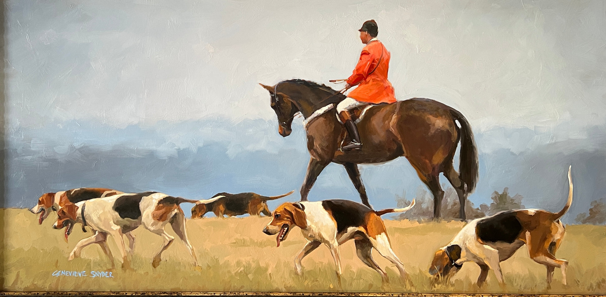Travel alongside these hounds as they make their way back to the kennels, guided by a Radnor hunt whip. Headed Home allows the viewer to experience the satisfaction of a successful outing and feel the happy fatigue of the hounds. Framed 42 x 24 oil on board