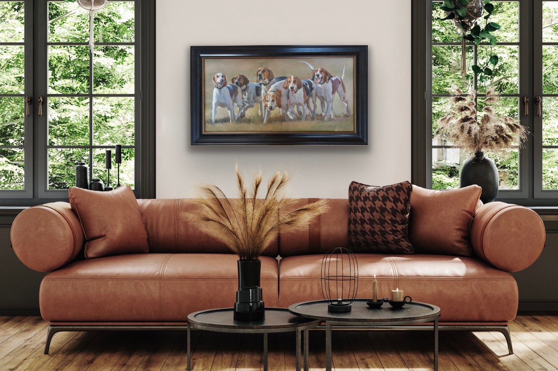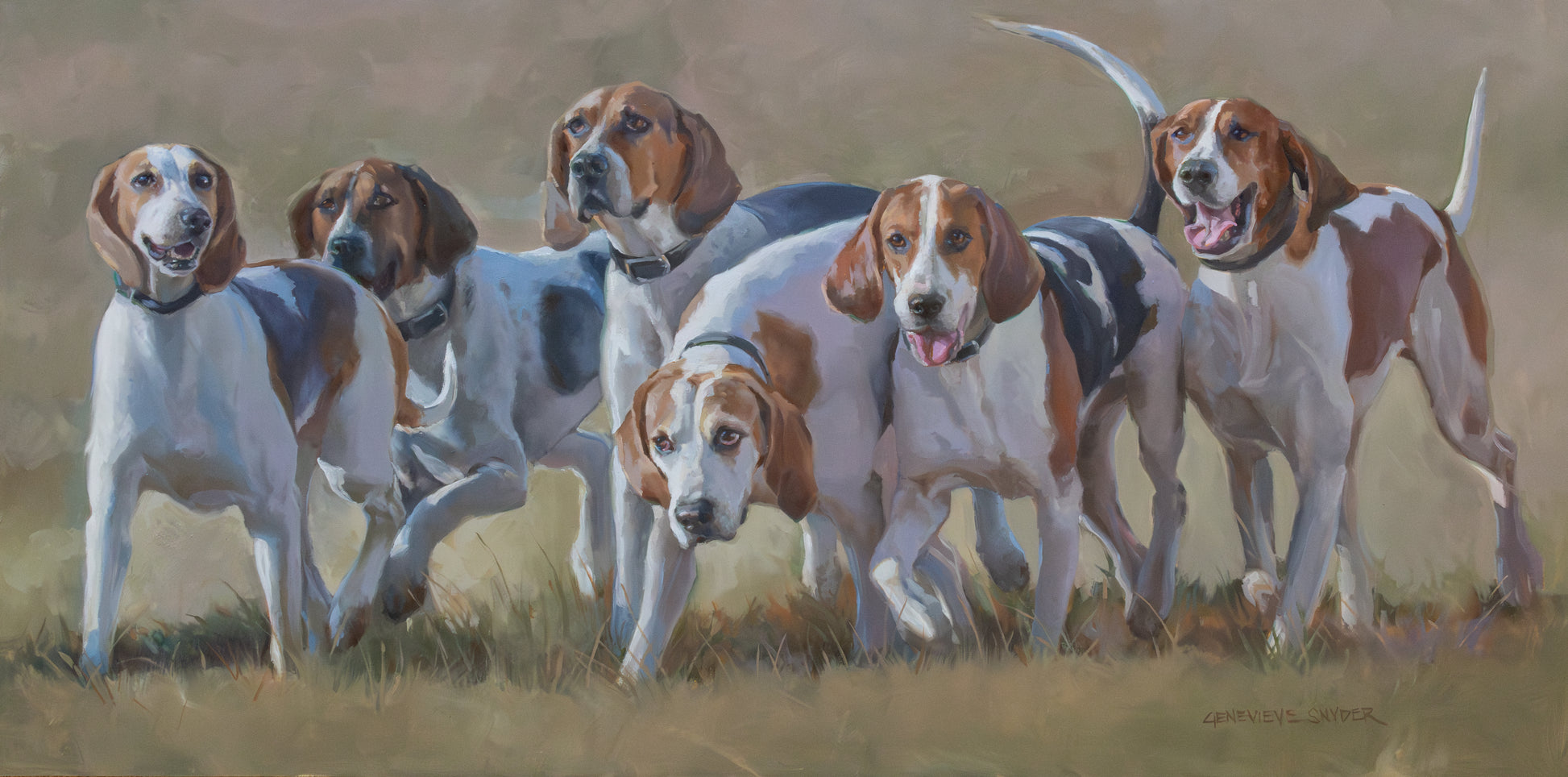 Six pack is a 40 x 24 framed oil on clay board featuring the Radnor Hounds.