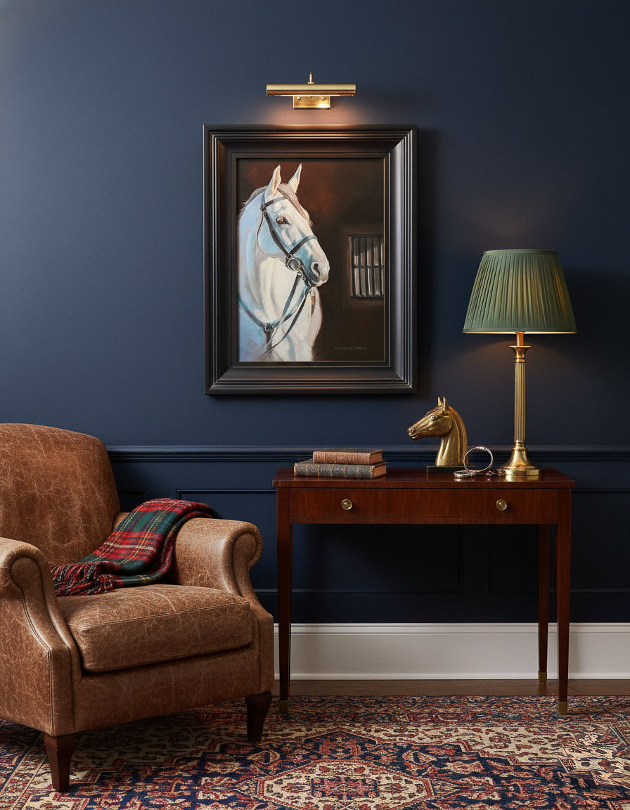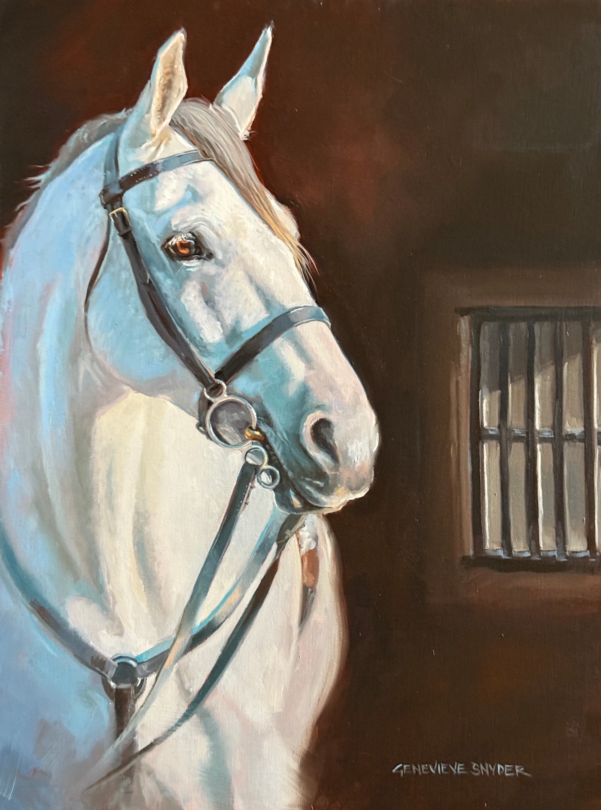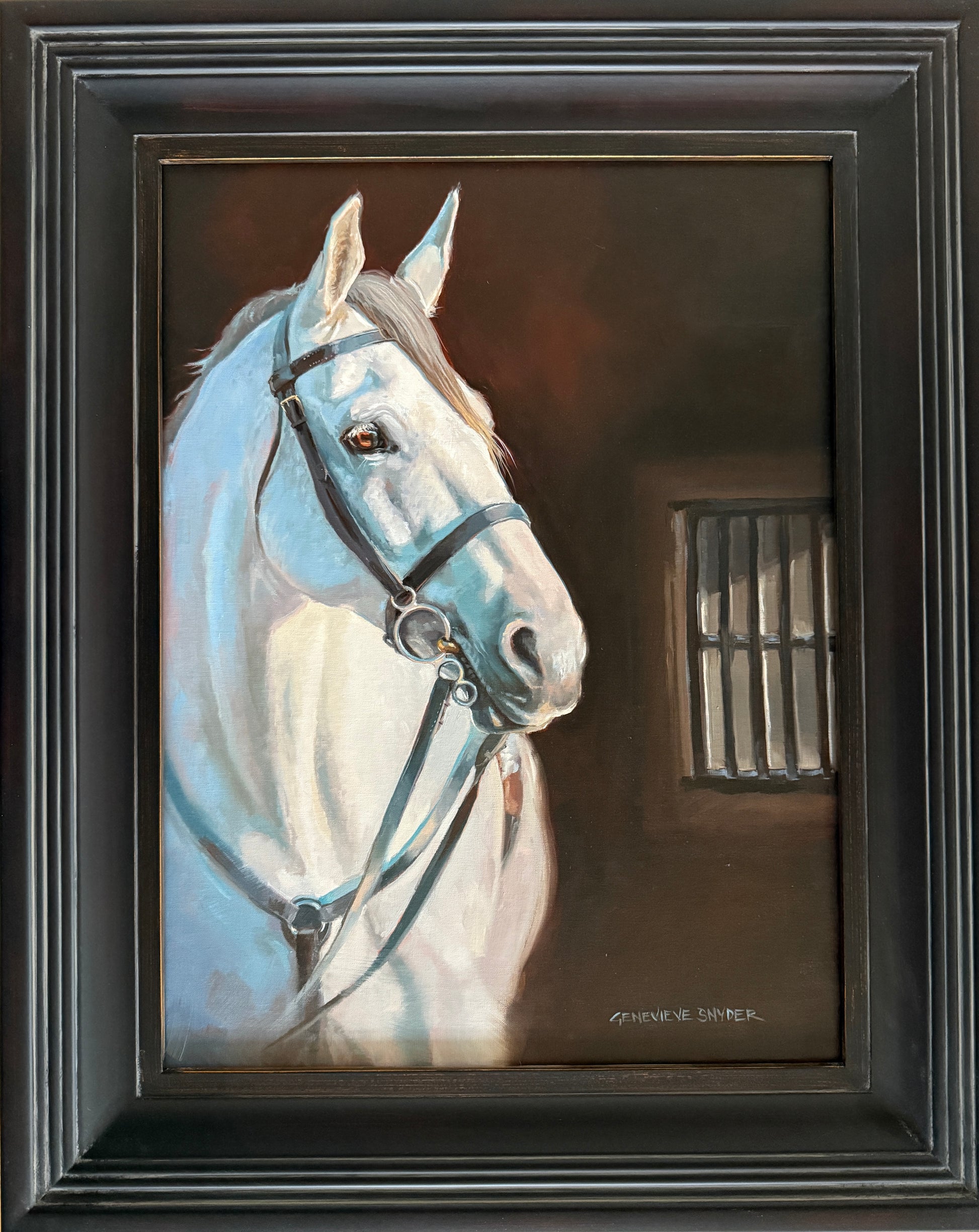 32"h x 26"w framed oil on linen portrait of Radnor Hunt staff horse Rebel.